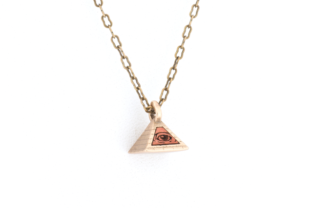 A small but solid Antique Bronze pyramid pendant, cast with brick detail, and inlayed with Pink Ivory wood featuring a detailed eye etching. Complete with our logo on the back.
