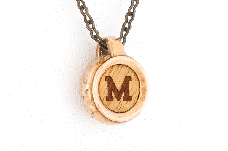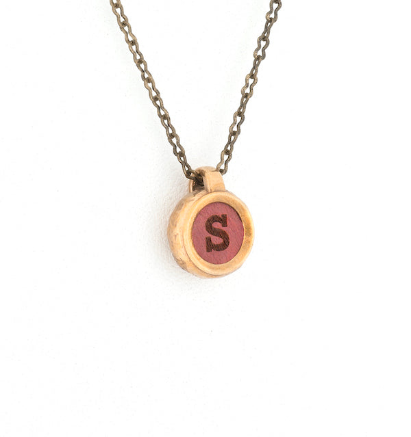 This petite pendant is cast in Antique Bronze with a distressed texture and our logo, inlayed with Osage, Pink Ivory, Ebony, or Curly Maple wood and etched with the letter of your choice.