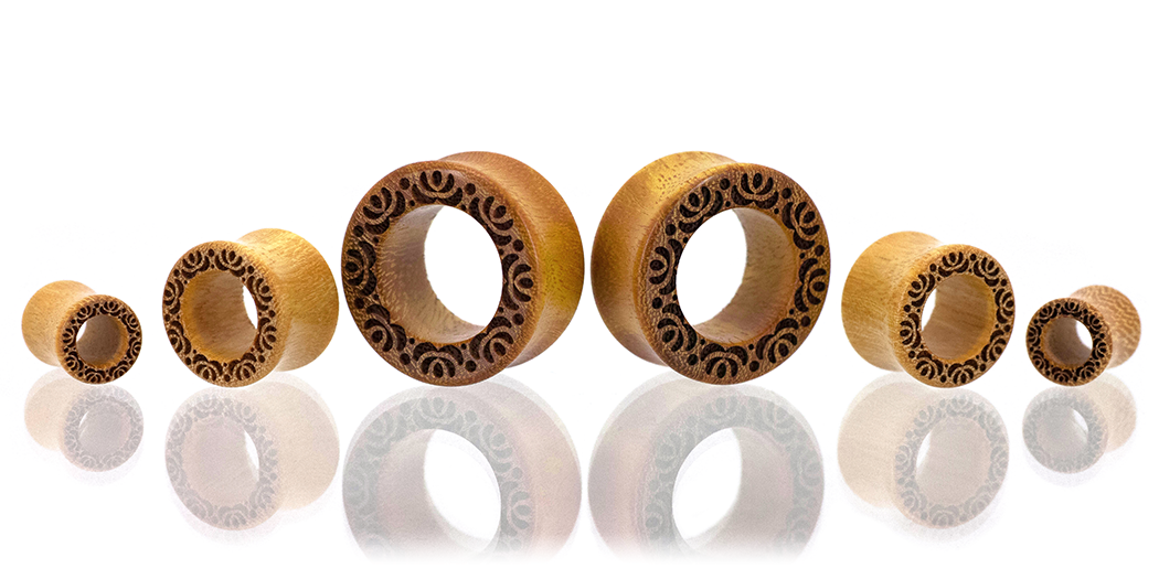 A peaceful and balanced pattern encircles the front faces of serene exotic Osage Orange wood flatty tunnels.
